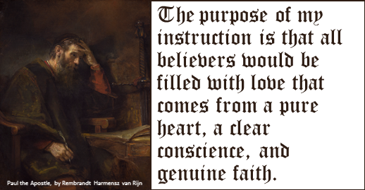 The purpose of my instruction is that all believers would be filled with love that comes from a pure heart, a clear conscience, and genuine faith. But some people have missed this whole point. They have turned away from these things and spend their time in meaningless discussions. They want to be known as teachers of the law of Moses, but they don’t know what they are talking about, even though they speak so confidently. (1 Timothy 1:3-7)