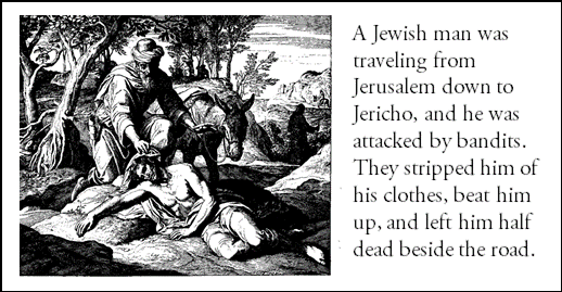 Jesus replied with a story: “A Jewish man was traveling from Jerusalem down to Jericho, and he was attacked by bandits. They stripped him of his clothes, beat him up, and left him half dead beside the road. “By chance a priest came along. But when he saw the man lying there, he crossed to the other side of the road and passed him by. A Temple assistant walked over and looked at him lying there, but he also passed by on the other side. (Luke 10:31-32)