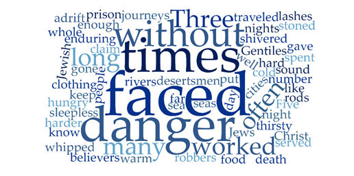 Are they servants of Christ? I know I sound like a madman, but I have served him far more! I have worked harder, been put in prison more often, been whipped times without number, and faced death again and again. Five different times the Jewish leaders gave me thirty-nine lashes. Three times I was beaten with rods. Once I was stoned. Three times I was shipwrecked. Once I spent a whole night and a day adrift at sea. I have traveled on many long journeys. I have faced danger from rivers and from robbers. I have faced danger from my own people, the Jews, as well as from the Gentiles. I have faced danger in the cities, in the deserts, and on the seas. And I have faced danger from men who claim to be believers but are not. I have worked hard and long, enduring many sleepless nights. I have been hungry and thirsty and have often gone without food. I have shivered in the cold, without enough clothing to keep me warm. (NLT Study Bible Text,) 2 Corinthians 11:23-27